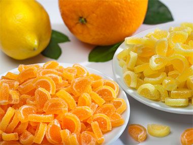 Die Gelee‑Ornamente sind als Dekoration für Kuchen, Torten, Eisbecher u.v.m. in den Geschmacksrichtungen Zitrone und Orange lieferbar.