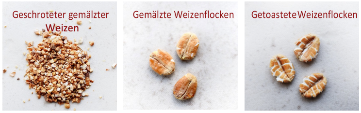 (geschroteter gemälzter Weiten, gemälzte Weizenflocken, getoastete Weizenflocken)